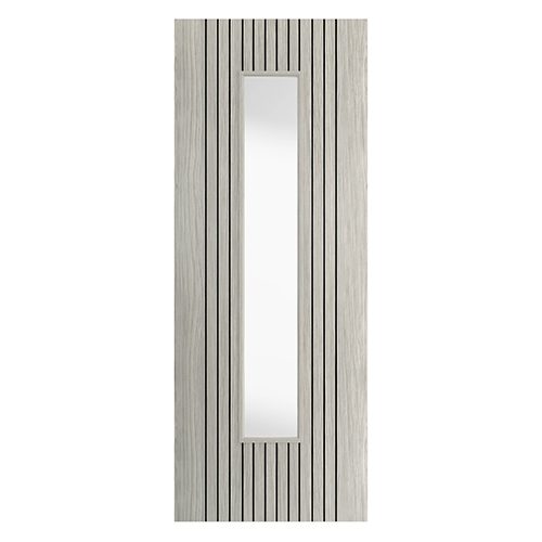Contemporary, light‑enhancing, and versatile. The Aria Grey Glazed Internal Door features a soft grey wood‑effect laminate with full‑length vertical grooves, accented by subtle black detailing. A clear flat safety glass panel with raised beading adds brightness and modern character, making this door ideal for stylish living spaces.