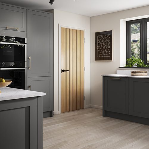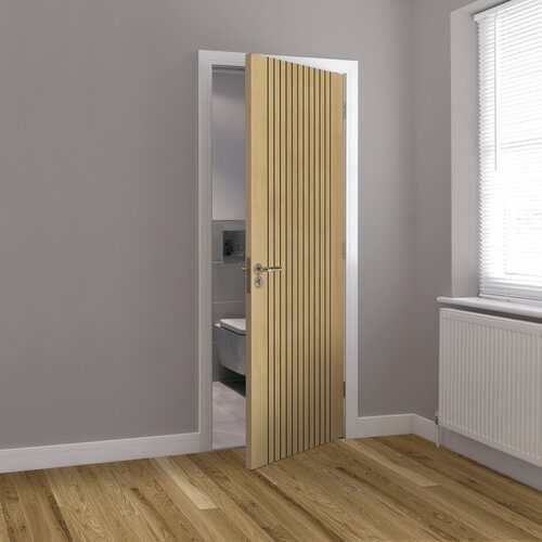 Warm, modern, and versatile. The Aria Oak Internal Door features a contemporary fluted design with full‑length vertical grooves, finished in a durable oak wood‑effect laminate with contrasting black painted grooves.