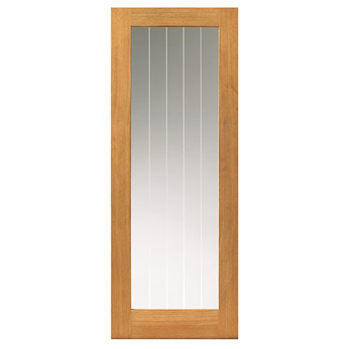 Traditional and bright. The Oak Thames Glazed Cottage Style Door features real oak veneer with a grooved centre panel and clear flat safety glass etched with vertical lines. Supplied fully finished and ready to fit, with an unfinished option also available, it combines timeless cottage styling with solid core strength. Metric sizes and rebated pairs are available from stock for added flexibility.