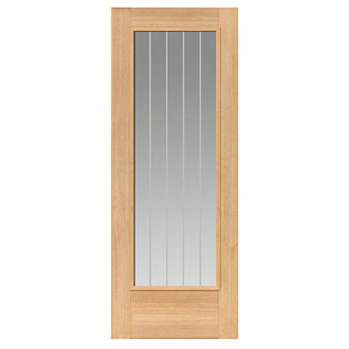 Timeless and fire‑rated. The Oak Thames Glazed Cottage Style Fire Door features real oak veneer with a grooved centre panel and clear fire‑resistant glass etched with vertical lines. Raised beading enhances the design, while the unfinished surface is prepared ready for a varnish finish. Built with solid core construction, it combines traditional cottage styling with dependable fire safety performance.